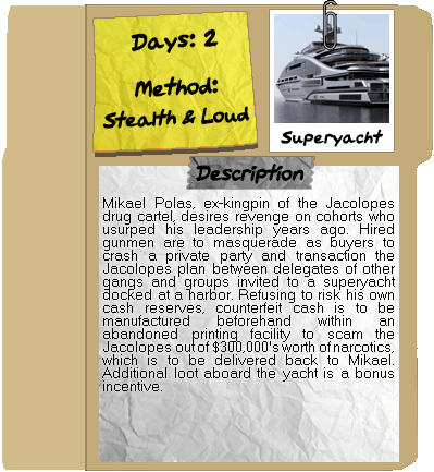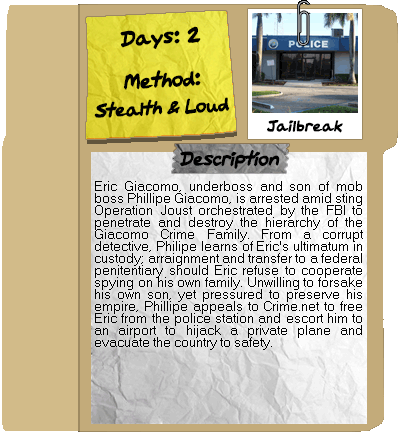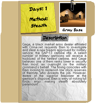 Crime.net is compromised; the identities of several members unveiled, including Dallas. While Bain scrambles to pinpoint and patch the information leak, Dallas' offshore account and spending cash linked through Crime.net, are rendered frozen and unavailable until further notice, until Crime.net recovers from lockdown mode. The unthinkable has happened: Dallas needs to find a regular job once more, as resorting to petty theft is not worthwhile the risk and his avenues to organize heists are severed. Despite the unpleasantness and menial work that may await him, Dallas must learn to adjust and wean himself off Crime.net.