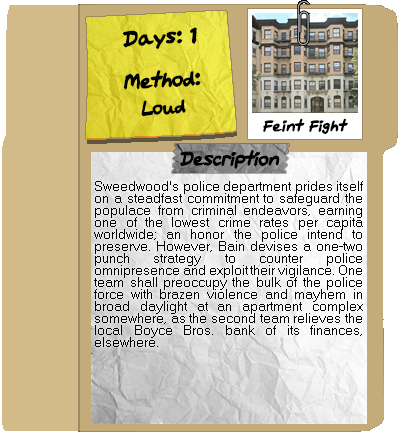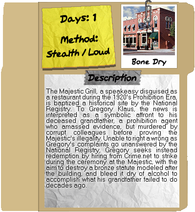 The years have changed nothing. The hit on Dallas, for his involvement in conspiring to play rival mob families against one another while part of the Chicago Syndicate, is still outstanding. The bounty for his life remains active and reward lucrative. While safeguarded under Bain's protection in Crime.net, not even Bain can monitor every awaking moment that Dallas balances his civilian activities with Crime.net.